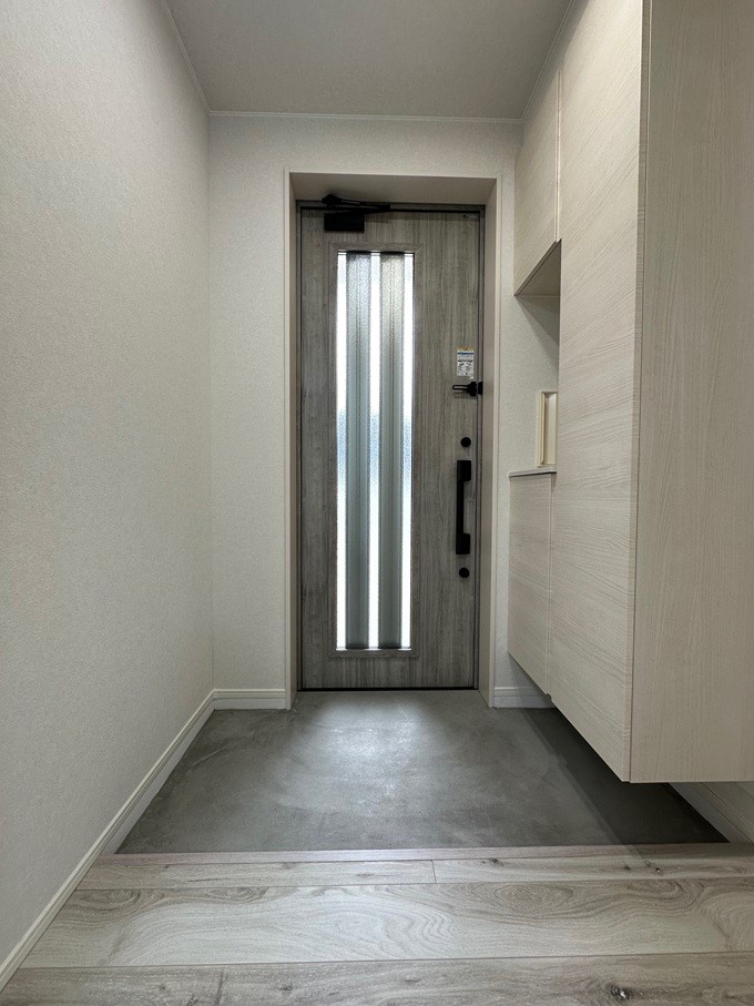 玄関ドアの色と土間、玄関ホールの床と玄関収納、全てがマッチしたまとまりのあるコーディネートに仕上がっています。