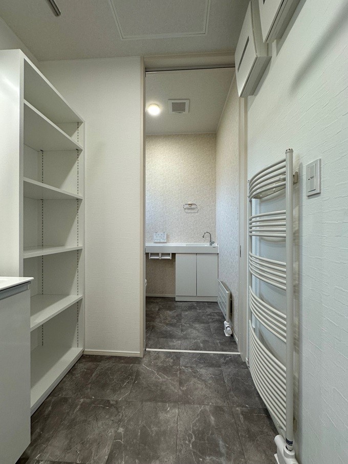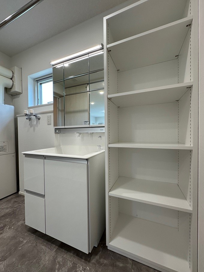 収納は使い勝手を優先して扉は付けずに高さが調節できる可動式棚を採用しています。 洗面台も機能性を重視したシンプルなタイプです。