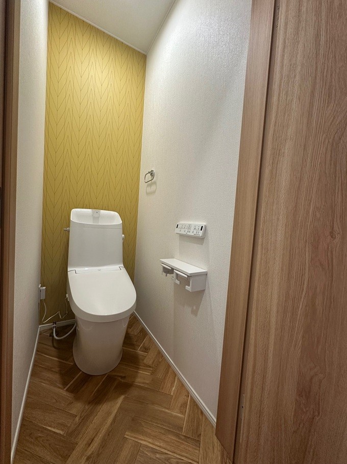 正面のアクセントクロスも遊び心があってトイレの閉塞感を和らげています。